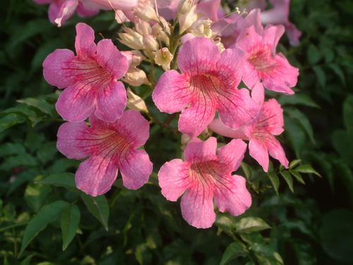 非洲凌霄(Podranea ricasoliana)是紫葳科非洲凌霄属木质藤本,顾名思义来自非洲,又名紫芸藤,茎干白色,对生奇数羽状复叶,花淡紫红色,花冠内有紫红色脉纹,喉部白色或浅粉色,花冠下面具有长腺毛,花瓣边缘有细柔毛。非洲凌霄,柔枝纤蔓,碧叶秀花。