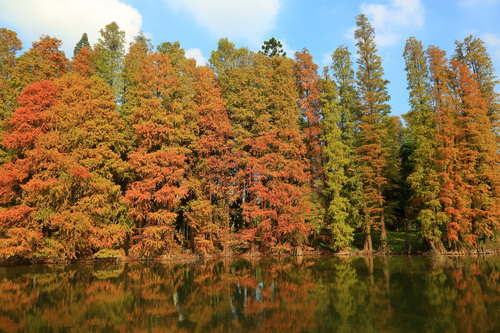 科普信息中心前三拱桥边的落羽杉,变色速度介于龙洞琪林和水生植物园两岸之间,现在颜色最为丰富,绿叶、黄叶、红叶共存,树丛倒影水中,层林尽染。