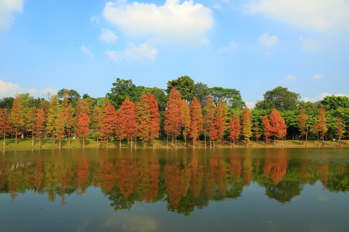 落羽杉、池杉、水松、水杉等都喜欢生长在水边,华南植物园水边有多处观赏红叶的景点——龙洞琪林(孑遗植物区、棕榈园)、水生植物园两岸及湖中心露兜园、科普信息中心前三拱桥边。各个景点的树叶变色程度不同,有的树已基本全部变红,最慢的才则刚刚开始变色。现如今,园内绿叶、黄叶、红叶共存,色彩丰富绚烂。