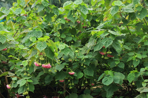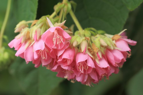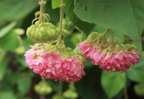 非洲芙蓉(Dombeya wallichii (lindl.) Baill.),梧桐科(Sterculiaceae)常绿大型灌木,叶片心形,较粗糙。开花时,长长的花轴上抽出等长的小花梗,粉红色至淡红色的小花20余朵,悬吊而下,钟形,组成漂亮的悬垂花球。