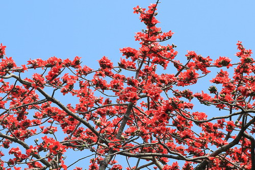 木棉的巅峰风景在春天。木棉先开花,后发叶,早春开花,树干挺拔,掌状叶片亭亭如盖,横看竖看都是美美哒,尔以为足矣,然而最美的风景却在盛花时节,木棉花浓烈绽放,仿佛撼天动地的一团团火焰,通透的红色直冲云霄,有着欲与天公试比高的气势。木棉花开震撼,落花也壮观,凋零时整朵花脱落,有别于花瓣飘零。木棉花瓣肉质,花瓣手感醇厚,被少量绒毛,在上班上学途中,忽然一朵木棉花掉在面前,像是突然蹿出来向你问好的顽童,若有兴致,捡起落花,让它唤醒童心,陪伴你一整天的愉悦。