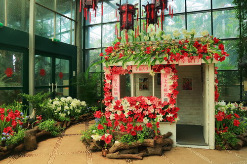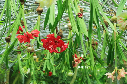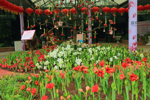朱顶红主题馆(热带雨林室)运用“移步异景”设计理念,造一方诗情花境。走进主题馆如入画中,随手一拍都是美景。展馆以朱顶红为主角,搭建幸福花桥、如意花屋、水帘花涧、丛林趣野等主题景点,配植金边莲等植物,融入童趣卡通、小清新等元素,利用枯木等环保花材,形成立体多面、色彩丰富的植物群落景观,营造源于自然、表现自然、回归自然的观赏氛围,让久居城市的市民可以随意穿行在绿叶红花之间,亲近自然。