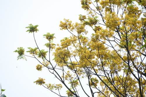 银珠的叶为二回偶数羽状复叶,小叶5-14对,长圆形。花瓣5枚,黄色。此时,它正值盛花,金灿灿的花开得满枝满树都是,又因为它旧叶已落,或新叶初展,或枝头仅有繁花金光流萤,暂无绿叶相衬,也是季相变化中的独特美、魅力,抬头看,枝上花美,低头赏,地上落花朵朵,也美。