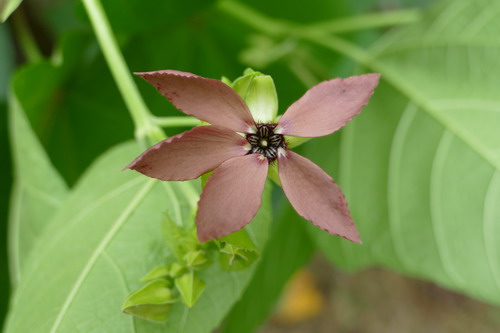 昂天莲是莲么?当然不是,它种在华南植物园生物园,跟朱槿、木槿、木芙蓉共居一室,当然就是锦葵科的货了。昂天莲(Ambroma augustum (L.) L.f.),锦葵科昂天莲属灌木,又名鬼棉花、仰天盅、水麻和假芙蓉。大家都知道,锦葵科的物种大部分开的花都是高昂着头的,这里的“昂天”说的是它的花么?偏不!这里说的是它的果实,昂天莲的蒴果膜质,具五条纵翅,成熟时,舒展开像一朵盛开傲立挺拔的莲花。从侧面看,这果实又像如同一个个杯子,又有人称之仰天盅。它非同寻常,它的拉丁名是Ambroma augusta,其中种加词augusta就是“庄严的,值得注目的”意思。