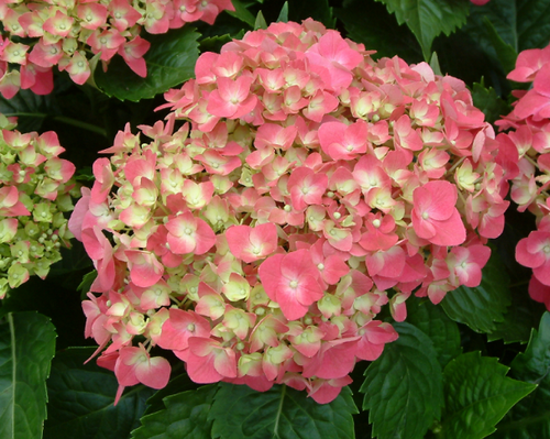 绣球花Hydrangea macrophylla为虎耳草科绣球属落叶灌木,株高0.5-1米。叶椭圆形或倒卵形,边缘具钝齿。伞房花序顶生,球状。花一型或二型,栽培的大多为一型花,即全部为不孕花,花瓣及雄蕊全部退化或缺少;有部分栽培品种是二型花,即花序外侧为不孕花,孕性花则生于花序内侧,花较小,可结实。国内目前栽培的都是选育品种,为保持品种优良特性大多采用扦插繁殖。