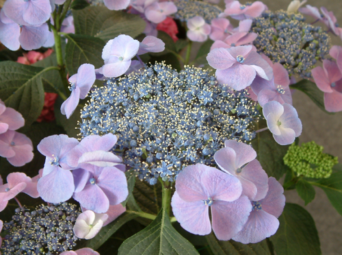 绣球花有一个奇怪的现象,同一株绣球花甚至同一个花球会有不同的颜色,这是为什么呢?原因是绣球花中的花青素起作用。酸性条件下显蓝色,碱性条件下显粉色到紫色,想获得不同颜色的绣球花则可以通过调节土壤的酸碱度来实现。