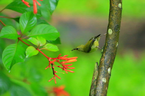 最近几年华南植物园内的叉尾太阳鸟明显增多,因为园内增加了蜜源植物的种植,尤其是叉尾太阳鸟喜欢的蜜源植物,有效地吸引了叉尾太阳鸟等野生鸟类和蝶类在园内繁衍生息,营造了花鸟昆虫等生物多样性的生态环境。