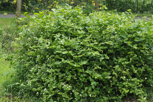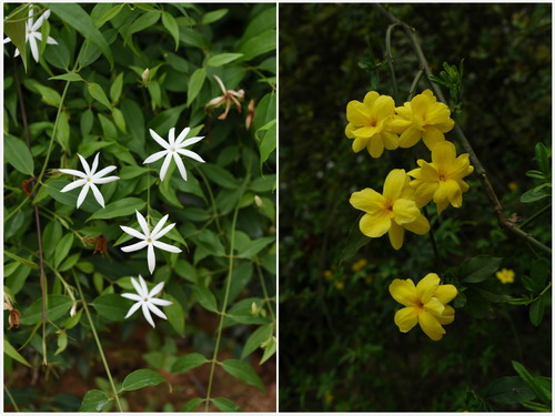 如今在广州茉莉花依然常见,素馨却不知所踪。可惜的是,华南植物园现在也还没有素馨,但在藤本园里,保育了茉莉花、川素馨、青藤仔(Jasminum nervosum)等一众素馨属家族的素雅小白花。它们没日没夜地盛放,再不记录一下,我都不好意思再去见它们了。除了白色的素馨还有黄色的素馨,比如云南黄素馨(Jasminum mesnyi),花与迎春花相似,又名野迎春,常绿灌木,枝条细长而弯曲从高处垂吊而下,花期11月至翌年8月。