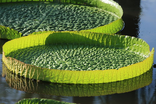 王莲是水生有花植物中叶片最大的植物,有“水上花王”的美誉。其初生叶针状,长至2-3片时矛状,4-5片时戟形,6-7片叶时完全展开呈椭圆形至圆形,叶缘直立上翘呈盘状,像数个大圆盘浮于水面,直径达1.5m以上。由于王莲的叶子背面布满了由中心向四周放射状的粗壮叶脉,叶脉内部具有特别发达的通气组织,里面储藏大量的空气,使得每片叶子浮于水面,可承重数十公斤的重量,因此小孩子坐在叶盘上面也不会下沉。多年连续生长的王莲叶片更大、占据极大的水域面积,可达十数乃至几十平方米,非常壮观。