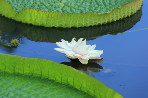 王莲娇艳的花朵在水面绽放,一株王莲即可形成异常美丽的生态水景,让人赞叹。王莲一般傍晚时分花葶伸出水面绽放,花大,直径达20cm-30cm,花瓣多数,初开时白色,香气浓郁,第二天清晨花苞逐渐闭合。傍晚时分再次开放,花瓣则变为淡红色至深红色,花瓣反卷,至第三天上午呈红色并沉入水中。由于颜色多变因此赢得了“善变女神”的美誉。