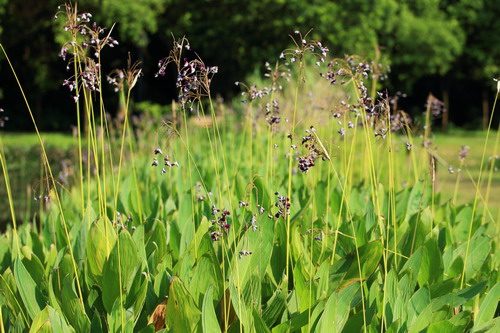 在华南植物园的水生园里,有一种植株高大美观,硕大的叶片形似芭蕉叶,叶色翠绿可爱,花絮高出叶面,亭亭玉立。蓝紫色的花朵素雅别致,一串串倒映在水中,妖娆多姿,恍惚间让人仿佛置身于江南水乡。她就是有着“水上天堂鸟”美誉的再力花。