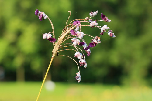 再力花(Thalia dealbata),又称水竹芋,竹芋科(Marantaceae)多年生挺水草本植物。高可达2m,全株附有白粉。叶互生,卵形,似美人蕉叶,青绿色,叶缘紫色,叶柄较长。复总状花序,花小,花柄可高达2m以上,细长的花茎顶端开出紫色花朵,像系在钓竿上的鱼饵,形状非常特殊,在7-10月间炙热的空气中优雅绽放,叶色动人,花姿优雅,为池塘与水景园带来淡淡的热带风情。其属名Thalia是为纪念德国16世纪博物学家约翰尼·赛尔(Johann Thal)而取的,种加词dealbata意为“被白粉的”。
