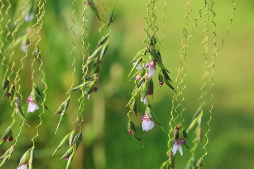 垂花再力花细丝状的花亭,一根根高高的挺出叶面,延伸出植株2倍高度。蝶状花朵倒挂在之字形的花梗下,在微风中轻轻晃荡,姿态飘逸,像身手不凡的杂技师在做高空舞蹈。与再力花相比,垂花再力花植株更为高大,花序下垂、耐寒性较差。
