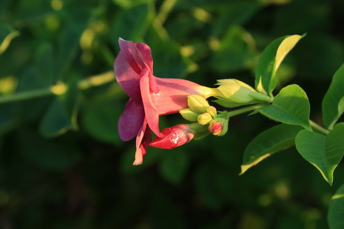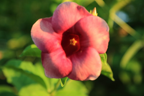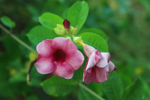 紫蝉(Allamanda blanchetii),常绿蔓性灌木,长可达3米,茎、叶都被白色绒毛,长椭圆形或倒卵状披针形叶片,通常4枚环绕轮生在茎上,让人过目不忘。紫蝉为聚伞花序,花冠大,直径7-10cm,因“面子很大”,别名又叫大紫蝉,淡紫红色漏斗形花朵,花冠5裂,裂片基部交叠,花冠筒喉部具有5个黄色的斑点,花冠筒内紫色较深,花冠边缘颜色较浅。秋天的紫蝉历经春的沉淀、夏的磨砺,越发葱茏,绽放出自信与豁达。