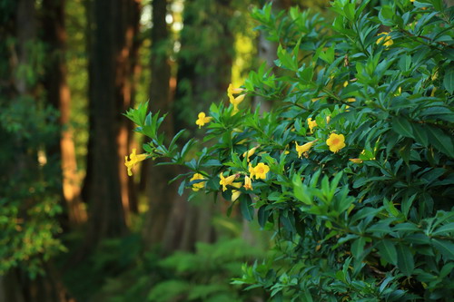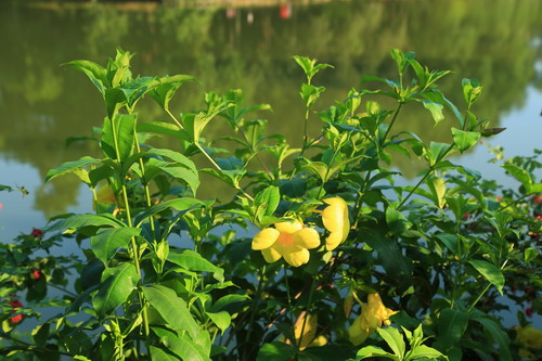棕榈园、孑遗植物区人工湖边,远远就能望见一片片黄灿灿的植物色块。其中不仅有黄蝉,还有软枝黄蝉。软枝黄蝉(Allemanda cathartica)为藤状灌木,攀援能力较强,飘柔下垂的枝条上,缀满金花朵朵,仿佛是“千朵万朵压枝低”。软枝黄蝉与黄蝉的最大区别就是软枝黄蝉花冠更大,花瓣少许向后翻卷像个大喇叭,黄蝉长长的花筒吹着小喇叭;一个藤状灌木,一个直立灌木。黄蝉属植物种植在岸边,巩固水土,丰富水面层次,虚实相间,营造滨水景观,突出自然野趣,让人回归自然之感。