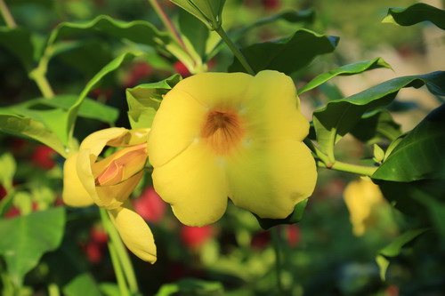 “桃花一簇开无主,可爱深红爱浅红?”唐代的杜甫春天独步寻花,江畔的桃花自由自在的开,绚烂绮丽的花儿应接不暇,诗人饶有兴味的反问,到底是该爱深红的还是浅红的呢?秋天正是夹竹桃科(Apocynaceae)黄蝉属(Allamanda Linn.)植物花开正茂的美好时光,园子里紫蝉、黄蝉无拘无束的开,弱弱地问一句,您是喜欢紫红色的紫蝉还是明黄的黄蝉呢?