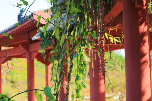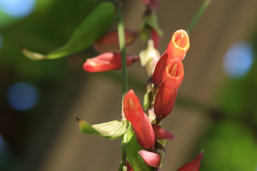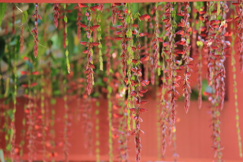 红花山牵牛是攀援藤本,顺着廊架攀援而上,垂挂下来一串串长长的花序。花还没开时,一个个红色的花蕾挂在藤蔓中,就像一个个小辣椒。花开时,鲜红耀眼,就像一挂天然的红鞭炮,格外夺目。漫步廊架,举目间见一朵朵红花疏落有致、排列整齐,有的含苞待放,有的灿然开放,随着微风舞动,好不动人。