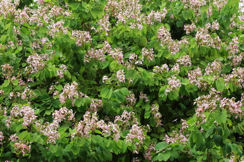 如果万一,你发现开紫红色花的红花羊蹄甲树上同时挂了果荚,那也不用惊慌。一般来说,这株树是嫁接的,就是在植株小的时候,将红花羊蹄甲的枝条嫁接在洋紫荆或羊蹄甲的树上。仔细观察一下树身,就会发现嫁接时留下的刀口痕迹,嫁接位之上的枝条开出紫红色的花,嫁接位之下长出的枝条则挂上了果荚。