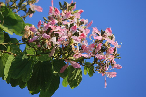 说她们之前,先简单介绍一下她们所在的羊蹄甲属。羊蹄甲属属名用来纪念瑞士-法国植物学家Bauhin兄弟。英文通称包括orchid tree、purple orchid tree、mountain ebony和poor man's orchid。而中文名的由来是因为这个属的叶片酷似羊蹄走过的脚印,因此名曰“羊蹄甲”。要是通俗地说,她们的叶片像各种款式的裤衩,我是没意见的。虽说羊蹄甲属物种的叶片是典型的羊蹄状,可是不同姐妹,其叶裂的程度和裂片先端的形状也有区别,叶片是它们的分辨特征之一。看了叶子形状,再来看花色,羊蹄甲属中按花的颜色命名的就有红花羊蹄甲、白花洋紫荆、橙花羊蹄甲、黄花羊蹄甲等等。