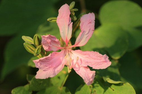 羊蹄甲的叶硬纸质,近圆形,先端分裂达叶长的1/3-1/2,裂片先端圆钝或近急尖,两面无毛或下面薄被微柔毛。开花时花瓣是淡淡的粉色,边缘常常有褶皱,她在所有姐妹中,花的颜色和款式可以说是最普通不过的,不算好看,还带着未老先衰的“皮肤”,看来做领导真不容易,劳苦功高嘛。除了花色,从她的雄蕊也能把她从其他姐妹中辨认出来,她每朵花有很明显的雄蕊,只有3枚。羊蹄甲花落之后,可以立马结果,进入秋冬,羊蹄甲的枝头上,既有花朵在开放,同时挂有豆荚状的果实,所以经常能看见花果同枝的壮观场面。