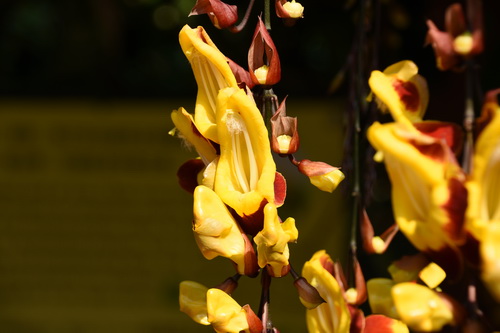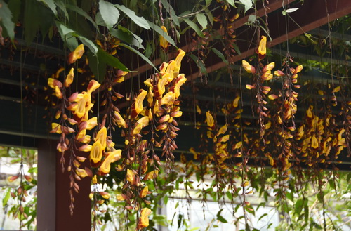 华南植物园2019年底网红之一的红花山牵牛的红花渐渐从枝头褪去,一个个萌哒哒的小鸟般的果实已经有模有样地向四处张望了。此时,在她隔壁,另一种美丽的山牵牛属植物又闪亮登场了,她就是大名鼎鼎的“跳舞女郎”——黄花老鸦嘴Thunbergia mysorensis,爵床科山牵牛属常绿藤本,和红花山牵牛是姐妹花。