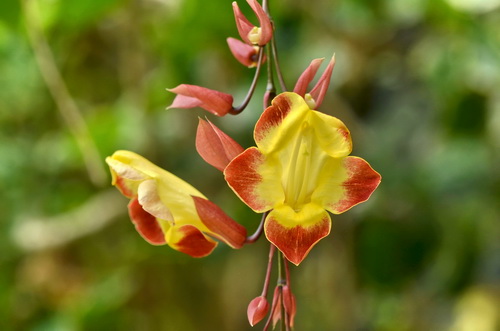 苏轼曾有诗云:“横看成岭侧成峰,远近高低各不同。”看山因看的角度不同,气势各异,花的姿态也如此。她似美丽的西班牙女郎在热舞,踏着明媚春光,恣意尽情地绽放,黄色的长裙,红遍的裙袂,在花枝上尽显热情、奔放;也有人说她像一只只嗷嗷待哺的小鸟张开嘴儿,在焦急等待鸟妈妈喂食;也有人说她的模样倒过来看,不就是一只只美丽多彩的高跟鞋嘛?!因此,有人称她为“舞者之鞋”。以我看,都像!你看她像啥?