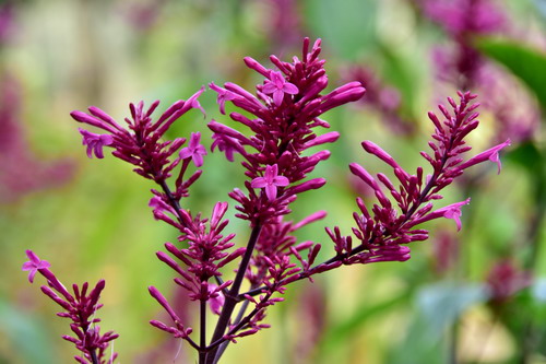 美序红楼花Odontonema callistachyum,爵床科鸡冠爵床属亚灌木至灌木。原产墨西哥和中美洲,我国引入栽培。茎近圆柱形,叶片卵状椭圆形、卵状披针形或长倒卵状披针形。聚伞圆锥花序,具分枝,花密集;花紫红色,冠管细长,冠檐裂片5枚,开展,盛花时,颇为壮观。花期12月至翌年6月,花期长,观赏性强,用于园林绿化、美化和庭院观赏。