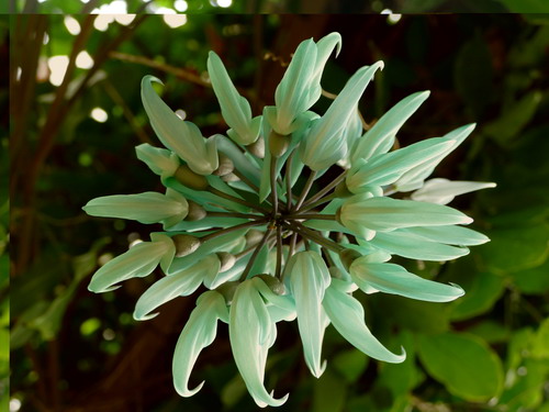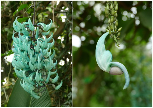 形似展翅小鸟的数十朵花儿自成一串,色如柔媚淡雅的绿松石构成特别景观……在华南植物园温室内的这种绿松石色小鸟花名叫翡翠葛(又名绿玉藤),是一种豆科绿玉藤属植物,2008年由泰国引进,现已成功移植华南植物园温室,是原产于热带雨林的一种珍贵植物。