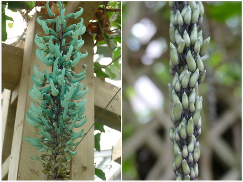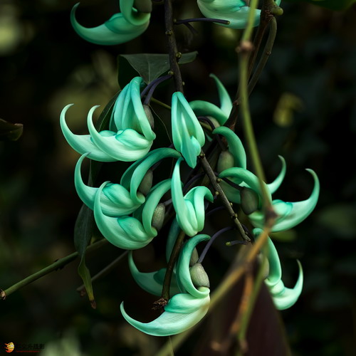 翡翠葛(Strongylodon macrobotrys A. Gray),又名绿玉藤,豆科绿玉藤属木质藤本,原产于东南亚热带雨林中,不耐霜冻,喜全光照。其花朵沿着花梗呈平展状生长,每一串花有数十朵,每一朵盛开的花像是一只绿松石雕琢而成的小鸟。花碧玉色透蓝色光泽,在阳光的照耀下,如翡翠般晶莹剔透,含苞的酷似翡翠象牙,盛开的如同翡翠雕琢而成的金刚鹦鹉的喙,弯弯上翘的龙骨瓣甚为张扬。其花形奇特,花色稀有。