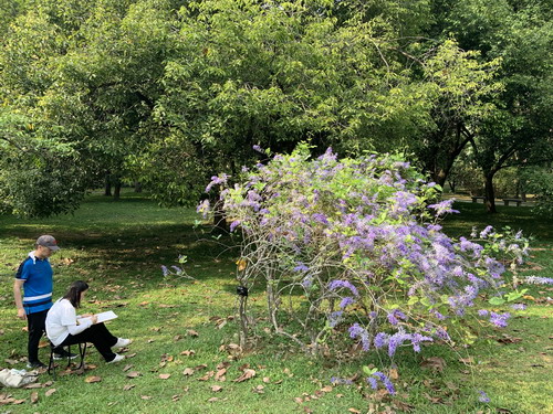 绿草丛中斜卧着一大丛盘根错节的藤本植物,沿着藤枝花环状的长满蓝紫色花朵,远远望去由高往下抛物线状向草地延伸。看惯了种种大朵红花之后,走进这株正值盛花期的“蓝花藤”,一下子被这么美丽的蓝紫色所惊艳。在华南植物园藤本园见到的这种观赏植物,她的老家在墨西哥、西印度群岛及中美洲。自从引进中国后很快就在南方声名鹊起成为网红。据了解,目前蓝花藤在华南植物园、福建厦门植物园、泉州等地都有栽培。