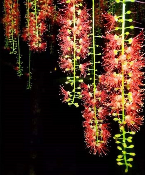 为了传承美丽,红花玉蕊需要一些夜晚出行的昆虫传播花粉,往往“日落而开,日出而谢”,但若天气适宜,比如说阴天,或阳光不那么猛烈,下午四点左右也曾见其少量花开。红花玉蕊的花期极其短暂,花团锦簇至落英缤纷也就短短几个钟头。红花玉蕊开花还有一个很奇特的现象,悬垂而下的花枝条三四十厘米,有些甚至长达五六十厘米。从顶端开始,一朵一朵按顺序从上而下盛开,整串往往得分两晚甚至三个晚上才能开完。所以,站在树下,看看花开的位置,就能清晰掌握花开花落的规律。