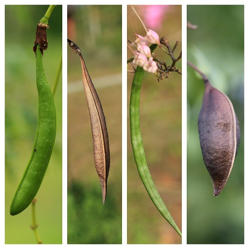 蒴果,从左至右:凌霄、厚萼凌霄、非洲凌霄、粉花凌霄(摄影:邓新华)