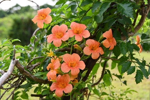 欣赏完自家的凌霄,再来认识下原产于北美洲的厚萼凌霄。同样依靠气生根攀爬的攀援木质藤本,攀爬能力很强。它与凌霄关系最为亲近,都来自凌霄属,花期为夏季。厚萼凌霄( Campsis radicans) 的属名Campsis,源自希腊文kampe,词意为弯曲,指的是本属植物生有弯曲的雄蕊;种加词radicans为茎上长根之意,依靠老茎上丰富的气生根攀援而上。凌霄和厚萼凌霄是全世界凌霄属仅有的两个原生种,厚萼凌霄与凌霄比起来,花冠筒部较长,花冠更为鲜红,花冠较小,条条芊蔓倾泻而下,垂花朵朵。