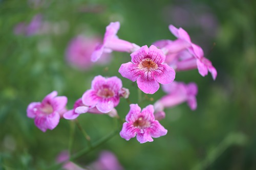 非洲凌霄(Podranea  ricasoliana)来自非洲凌霄属,从名字就能猜到,原产非洲,叶柄具凹沟,花色粉紫色或紫红色,花冠先端5裂,花冠筒内面具紫色条纹且有柔毛。一年四季枝繁叶茂,植株可有多个花序同时开放,姿态婆娑优美,颇具观赏价值。