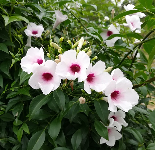 大自然是真正的调色高手,除了橙红、鲜红、紫红的凌霄外,还有粉花凌霄(Pandorea jasminoides)。它为粉花凌霄属常绿木质藤本,原产澳大利亚,一年四季均开花,春天为盛花期。其绿叶有光泽,花冠白色至粉红色,内面喉部及冠筒深红色且有细柔毛,雄蕊内藏,花姿柔美悦目。