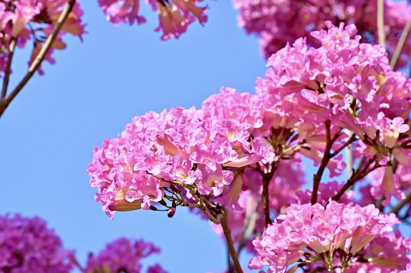 紫花风铃木开花时,远远望去,繁花堆锦,满树紫红或粉红一大片,走进细看,花球压枝,一簇簇结团成风铃般随风摇曳。