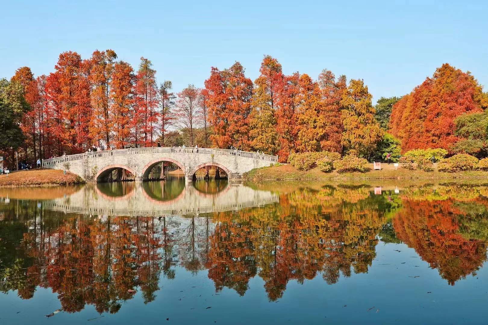 时光荏苒,雅致的水榭、古朴的琪林桥已分别被列为“广州市历史建筑”及“广州市传统风貌建筑”,她们如慈祥的老祖母,慈爱地凝望着她的儿孙们。挺拔的大王椰子、调皮的鱼尾葵、稳重的落羽杉,她们婆娑的树影在水平如镜的湖面交织着,追逐着,打闹着,仿佛向人们发出邀请:一年好景君须记,一定不要辜负如今这世外桃源的无边美景。