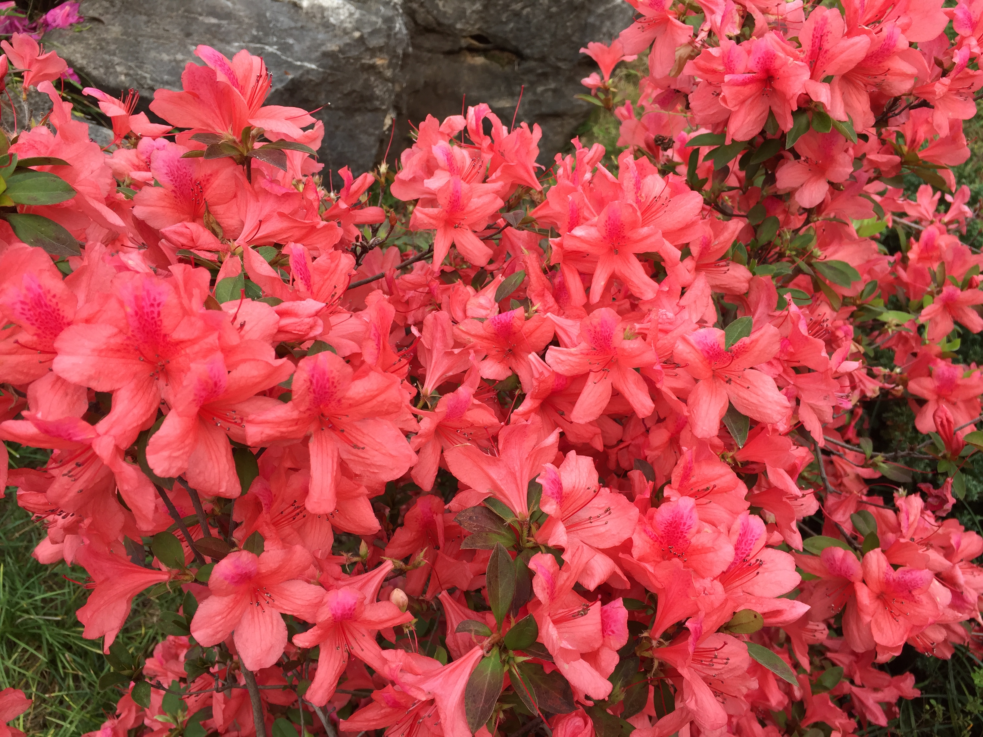 在观瀑桥旁的小山坡上、在正门小广场、在中心大草坪,几千株杜鹃Rhododendron simsii(又名映山红),效仿自然景观,形成小片杜鹃花海,一片红艳,如火般热烈,跳跃在春天的阳光下,看着看着,心花渐渐与花儿一同绽放起来,在春光中尽享希望和喜悦……