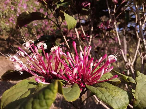 烟火树(Clerodendrum quadriloculare (Blanco) Merr.),别名星山茉莉是马鞭草科大青属绿灌木或小乔木。见过它开花的样子,就知道其名字的缘由。名如其花,聚散状的花序,花束众多,花筒紫红色,每一朵前端炸开五片洁白耀眼的长条形花瓣,宛如繁星闪烁,远看亦似团团爆发的烟火,微风一吹,弹跳起舞不停,“舞动”春日之美。