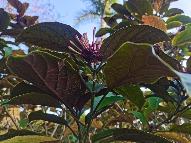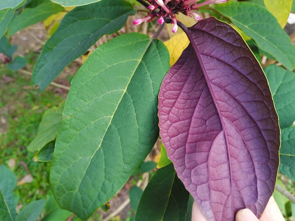 除了耀眼的花朵,烟火树的树形和叶片也很有观赏价值,墨绿色的新枝四棱形,柔软而有韧性,婀娜多姿;对生的叶片卵形至长圆形,具有尖端和略带波浪的边缘,质地厚灰绿色,叶背是有光泽的紫色,因此它的另一个别称为紫背大青。独特的双色叶植物,不开花时叶片也十分优美,在园林绿化中常作观叶植物观赏。据相关的研究报道,烟火树的根还具有一定的药用价值及营养保健作用,具有较高的开发前景。