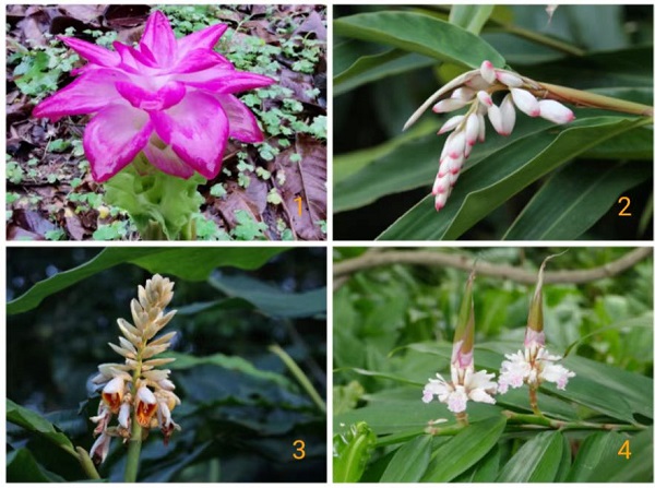 姜科花卉正盛放:1大莪术,2艳山姜,3桂草蔻,4益智
