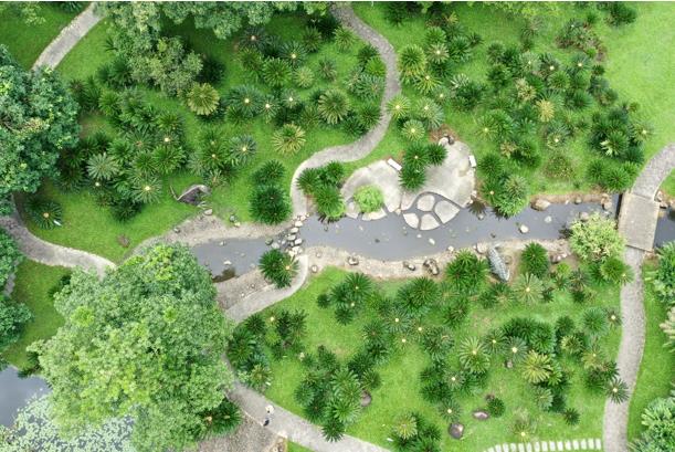 只见历经千年风霜的越南篦齿苏铁树干如盘虬卧龙,苍劲有力,婆娑的树形刻满岁月的痕迹,修长舒展的大型羽叶青翠光亮,恰如凤凰之羽毛。这6株正在开花的越南篦齿苏铁镇守在苏铁园的入口之外,显得威武而又庄严。