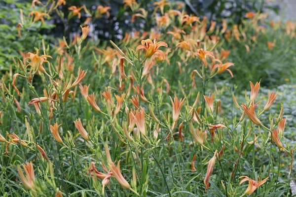 萱草自古就是人们喜欢的观赏植物,高低落差的株型,袅娜多姿,生命力旺盛,管理粗放。多栽植于花坛路边庭院间观赏,开花时一片橘红色,十分美丽。唐代李咸用有咏《萱草》诗“积雨莎庭小,微风藓砌幽。莫书开太晚,犹胜菊花秋”。