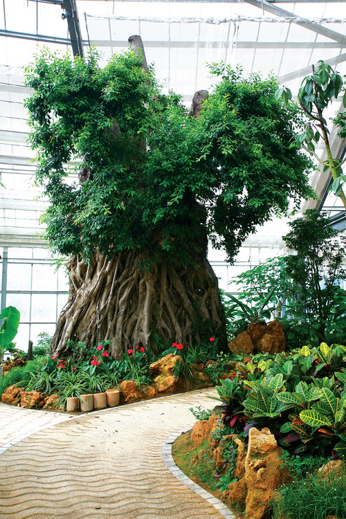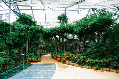 热带雨林室高27.4 m,占地面积7987m2。1000多种热带植物来自世界各地,姿态万千、色彩缤纷,营造了雨林奇观区、水生植物区、奇趣植物区、雨林文化区、雨林群落区、中心瀑布区和河谷雨林区七大主题景区,演绎了神秘的热带雨林世界。高耸云天的望天树、满腹毒汁的见血封喉、突降暴雨的雨树、载人如舟的王莲、酸尽甘来的神秘果、吐雾吞烟的吐烟花、粗壮神奇的面包树、饱含柴油的油楠、暗藏杀机的茅膏菜,济济一堂;绚丽的空中花园、多姿的独木成林、别有洞天的空心树、秀美的老茎生花、厚壮的板根,多姿多彩;汇集绞杀的傲视群雄、巨藤的密林穿梭、寄生的巧取豪夺、腐生的蝇蝇苟苟、附生的高枝攀附、共生的和谐共存,琳琅满目。