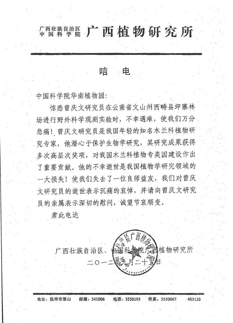 广西植物研究所发来唁电