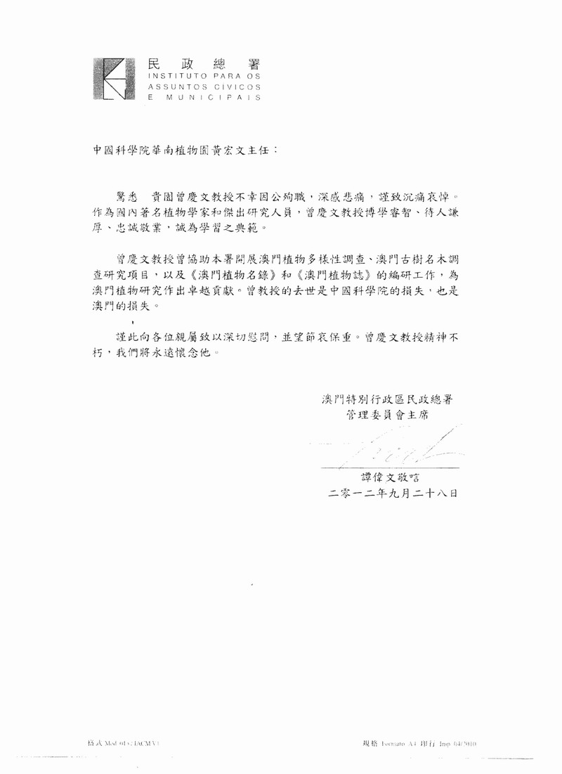 澳门特别行政区民政总署管理委员会主席谭伟文发来唁电