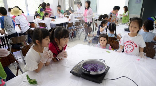 回到科学实验室,众人立刻化身小实验家,通过亲自动手来感受寓教于乐的欢快氛围。第一个小实验是“神奇的水中花”,孩子们先将纸花涂上颜色,将“花瓣”弯折后轻轻放入水中,透过纸纤维吸水膨胀的原理,过一会“花瓣”便缓缓打开,宛如开花的景象。紧接着是用红球甘蓝提取的植物色素来做变色小实验。需要通过熬煮红球甘蓝,来提取它色素啦。通过它的色素,在与醋、苏打水、碳酸水混合后,则会发生了神奇的化学反应——变颜色。随着实验进行,大家积极的动手实践,并和身边的小伙伴一同交流互动。在溶液混合发生颜色变化的那一刻,大家发出惊叹的声音,更有小朋友开始尝试更多“试验”,通过控制溶液比例,来尝试调配出不同的颜色。