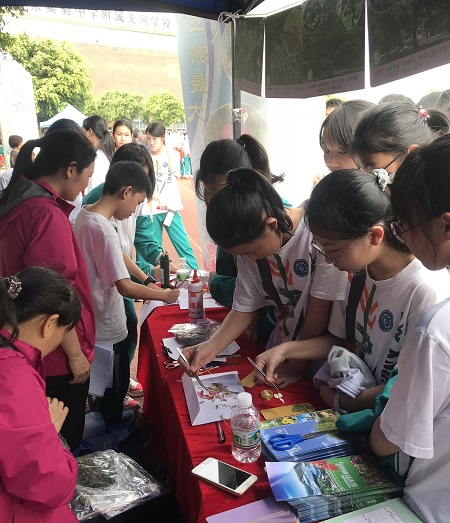 活动现场,来自中科院华南植物园、广东科学中心、中科院广州能源所、广州市第一人民医院等科普联盟成员单位带来的联展,让现场同学热情高涨,积极参与体验,享受科普饕餮大餐。活动内容以科普互动展品巡展、科普知识现场讲解、互动活动等丰富多彩的形式向学生们进行科普教育宣传。华南植物园向师生们推介了目前所开展的系列自然教育课程,并让孩子们亲自体验植物压花书签制作,种子陀螺、趣味认种子、画出心中那半片叶子等多个互动科普项目,深受孩子们的喜欢,在欢声笑语中学生们与科普志愿者一起玩游戏、认植物、做手工、进行自然艺术创作,在体验中学习了植物学知识,感受到科学的魅力。