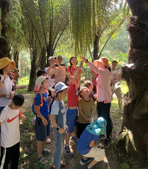 棕榈园里,三药槟榔树下老师提醒说,大家看看地上,是不是有果实?大家弯下身子在草地上寻找着,果实是橄榄形或是卵球形,是不能吃的噢。三药槟榔只有一个顶芽,主要靠种子进行繁殖,它的发芽时间比较长。在老师的引导下,我们前后认识了好多种棕榈科植物,如封开蒲葵、象鼻棕、砂糖椰子、皇后葵、琼棕、鱼骨葵等。印像最深刻的,不得不提砂糖椰子,数十条花序梗下弯垂下来,分枝上挂满一个个青褐球形或卵圆形的小果子,印证着这个丰收的季节。