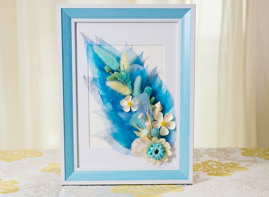 制作材料:染色叶脉、兔尾草、雏菊干花、秋葵果实、小星花、羽毛、贝壳、海螺、相框、热熔胶枪。